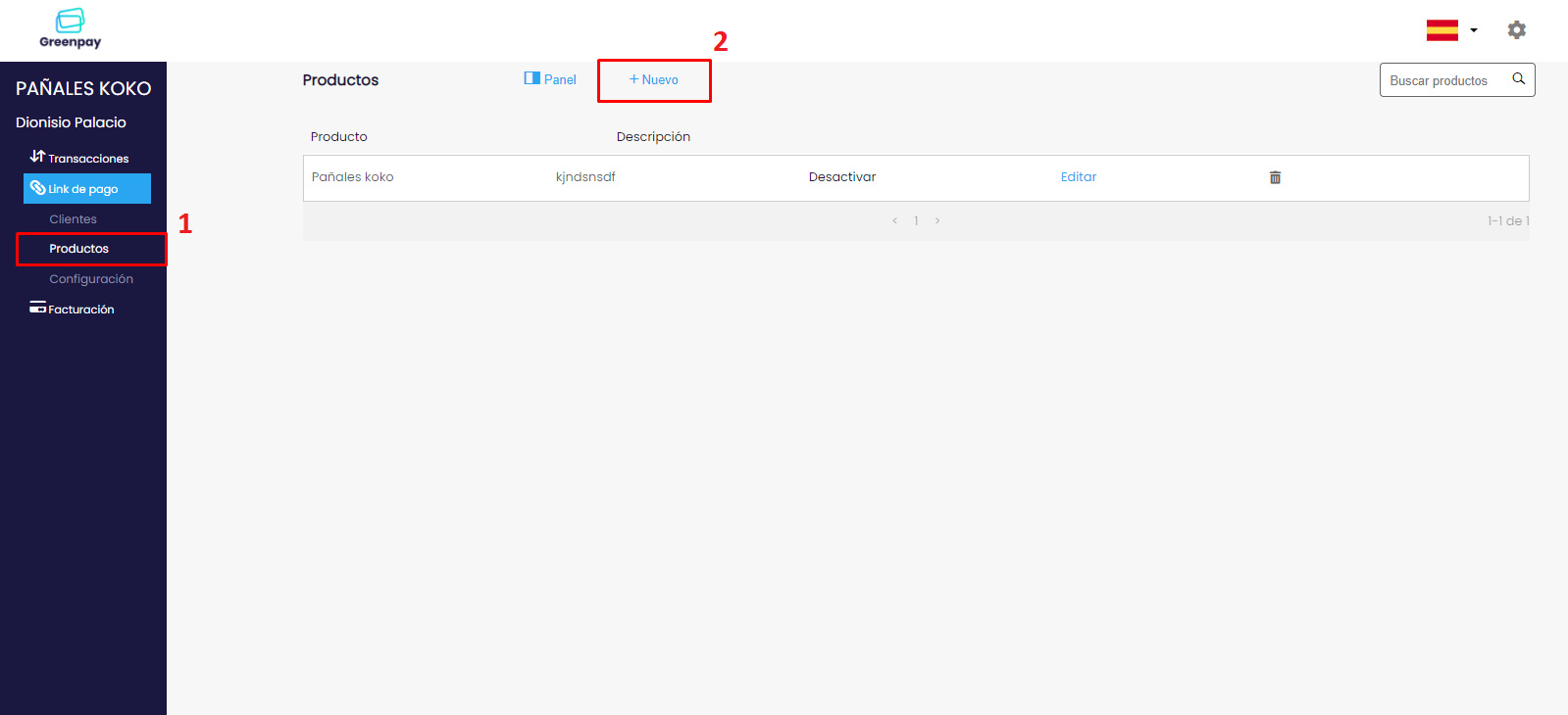 Para crear un producto se debe dirigir en el menú izquierdo a la opción “Productos“, esto le mostrará todos los productos creados. En la esquina superior de la vista se mostrará el botón “Nuevo“. Como se muestra en la siguiente imagen: