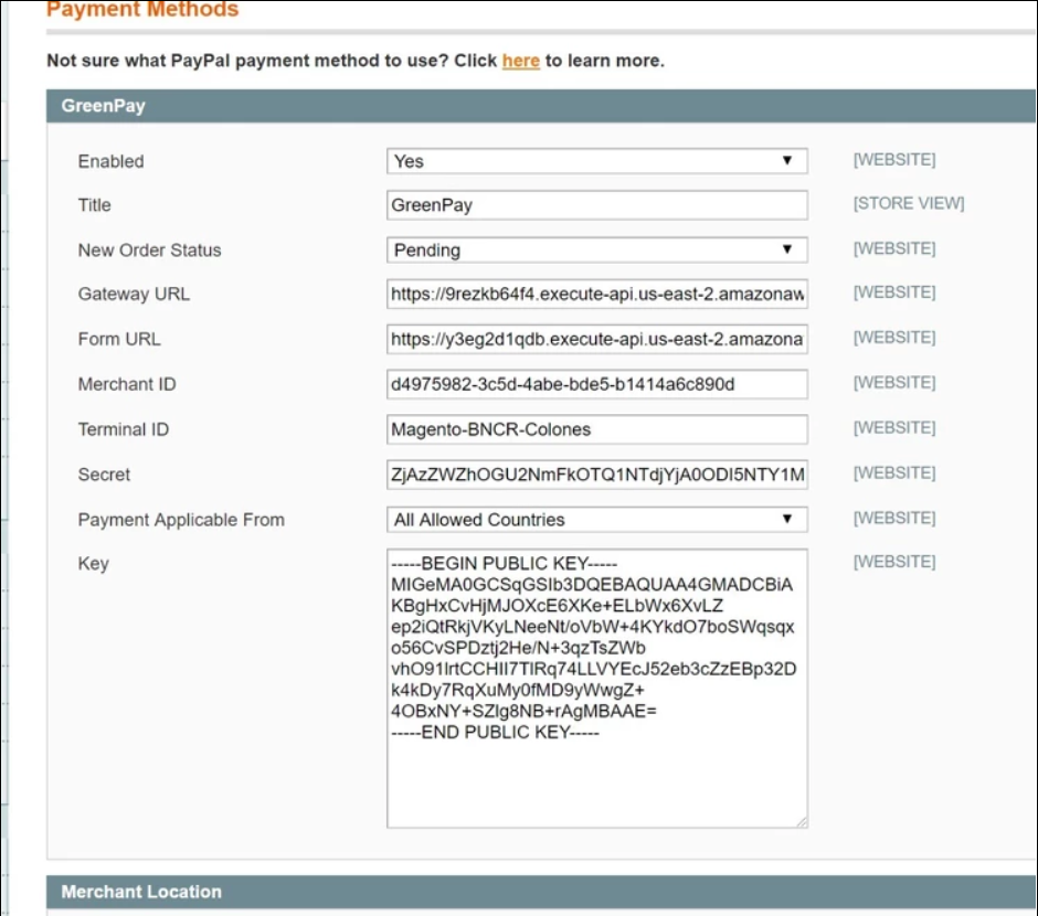 Para configurar nuestro plugin debes ir a "System>Configuration>Payment Methods", donde se desplegarán las opciones de configuración de Magento, y se debe seleccionar la sección "GreenPay".|