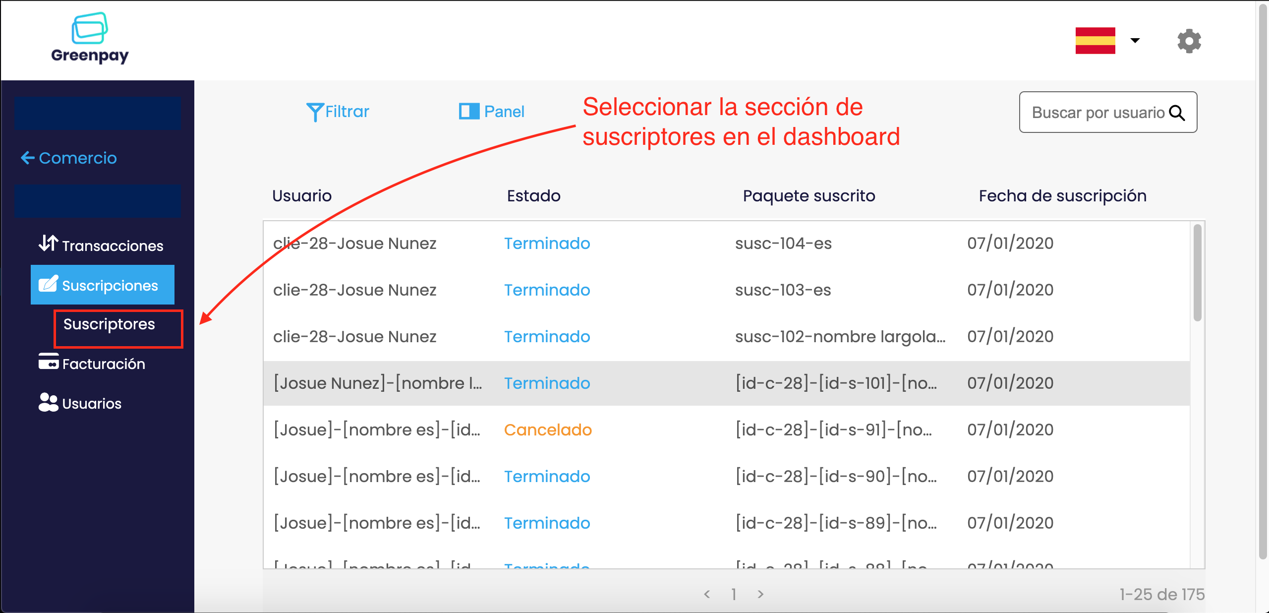 Las suscripciones o pagos recurrentes de un comercio se muestra en la sección de suscripciones del dashboard, como se muestra en la siguiente imagen.