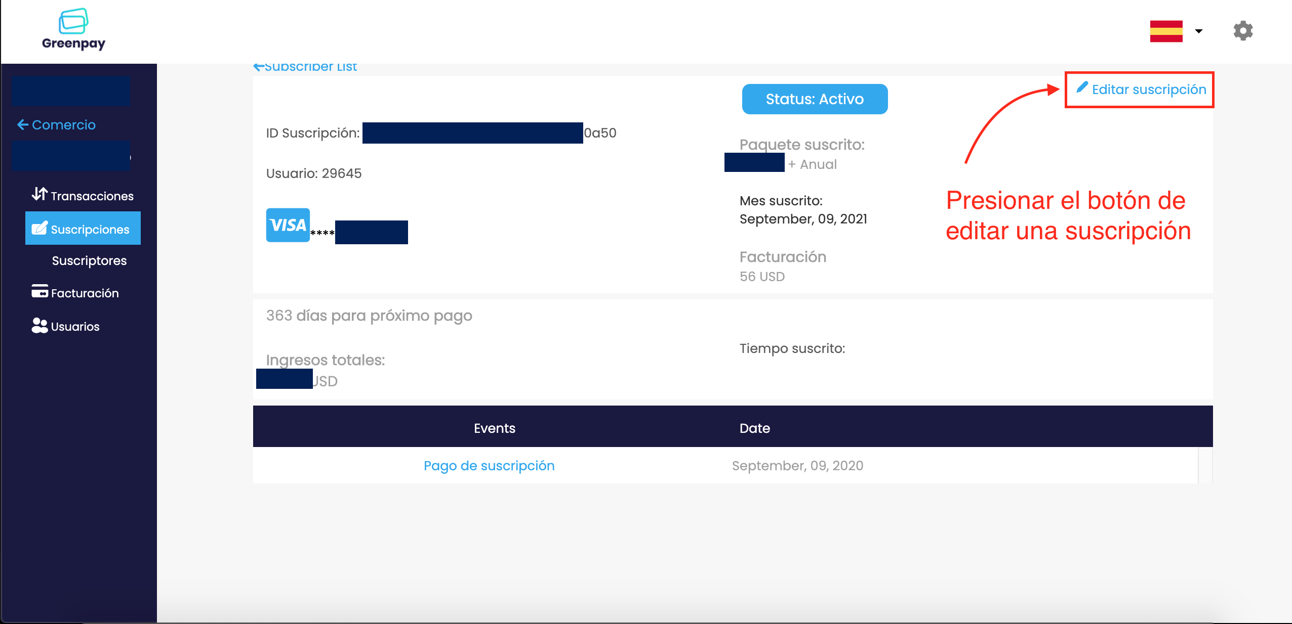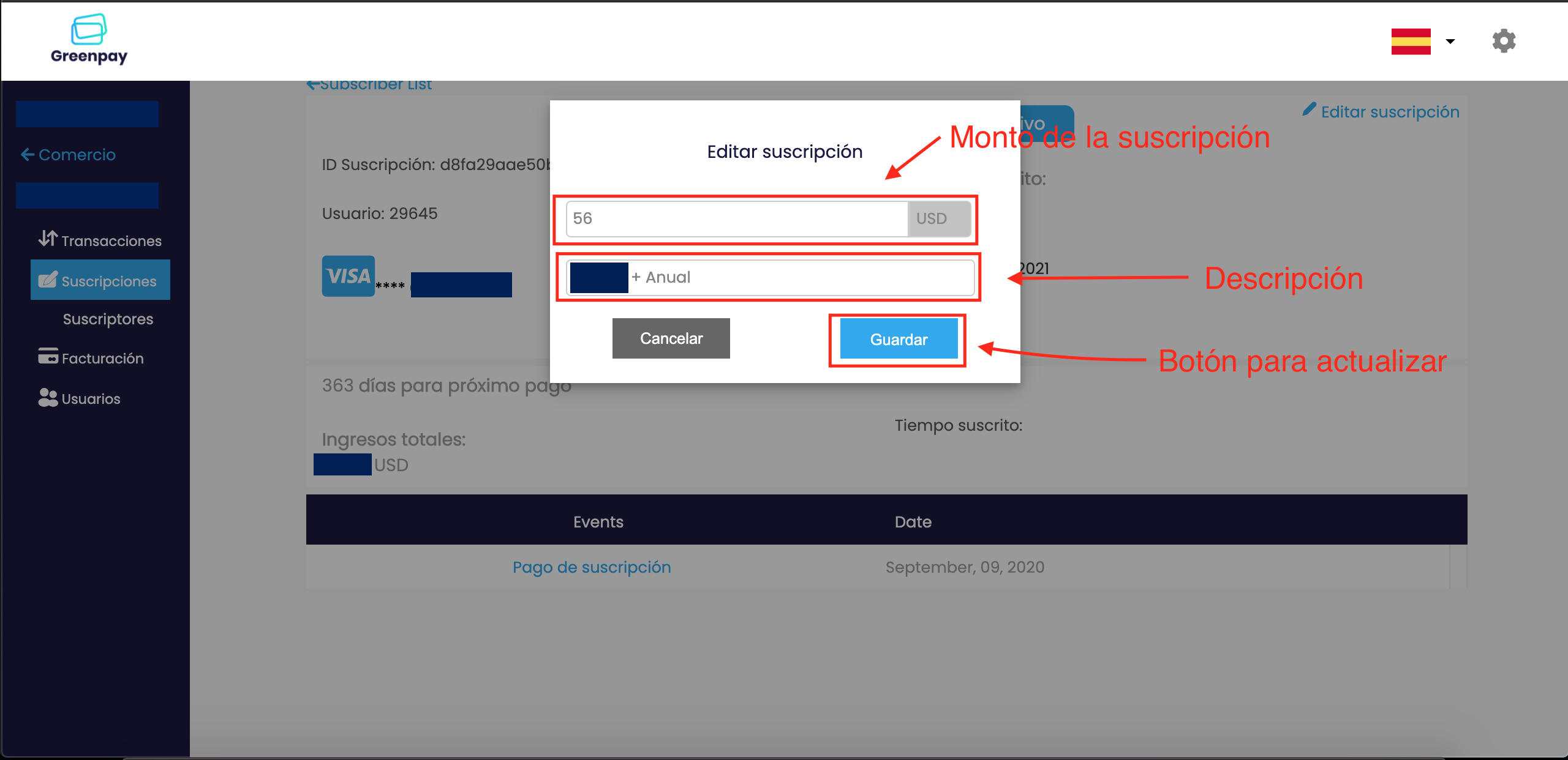 - Tener integrado el servicio de suscripciones del API Greenpay para su comercio.