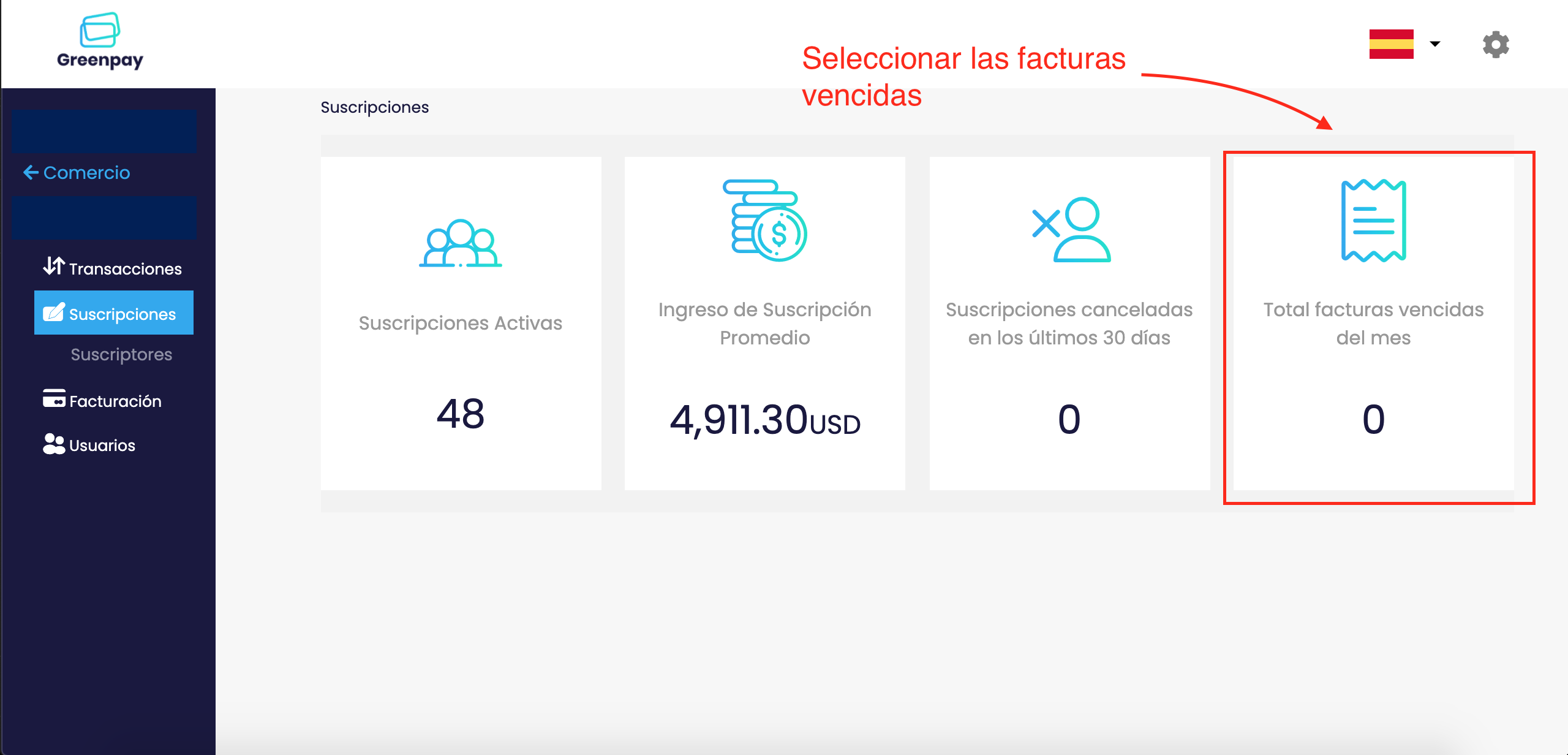 - Ingresar a la sección de suscripciones y selecciona todas las facturas vencidas del mes, como se muestra en la siguiente imagen.