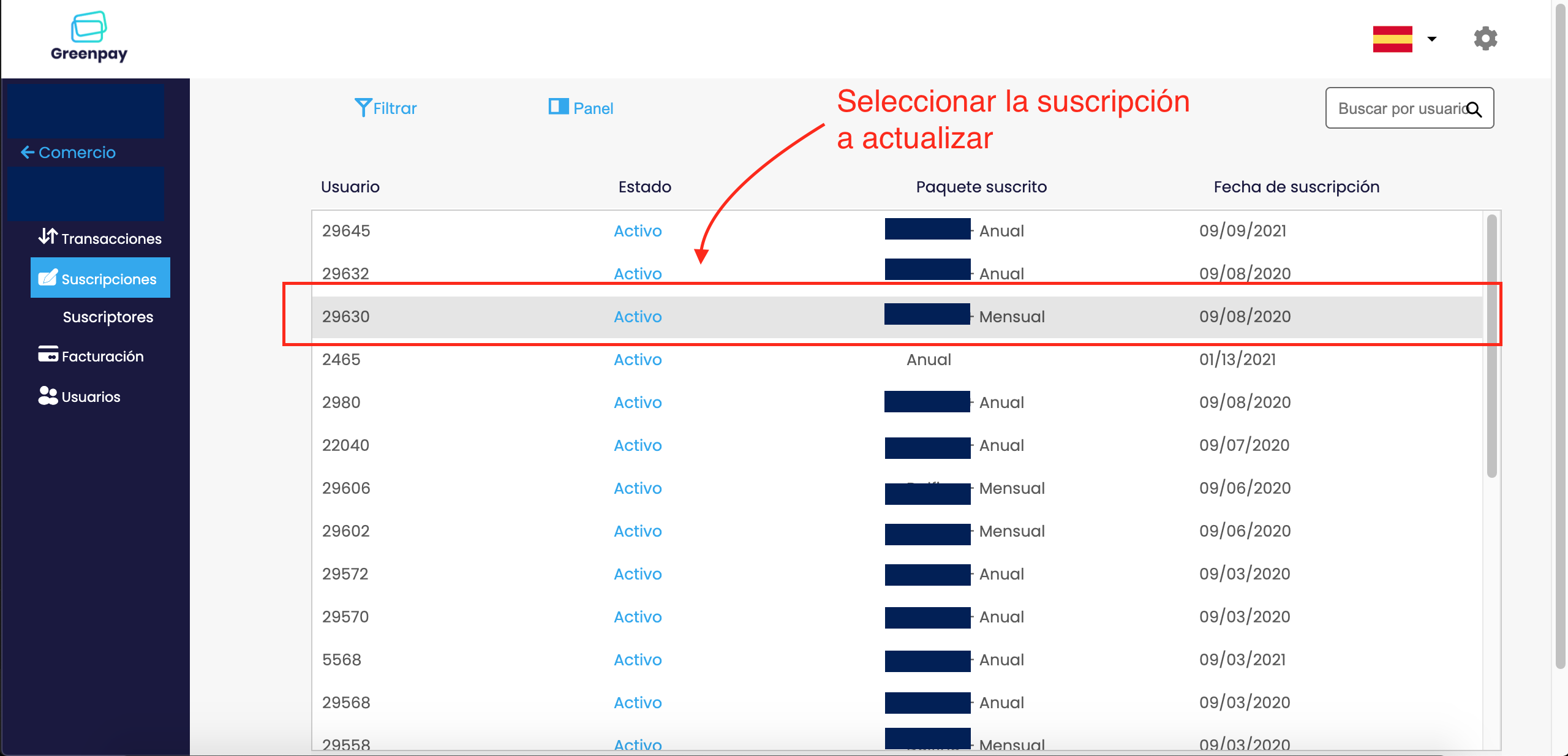Desde el dashboard se puede actualizar el monto y descripción de una suscripción, para esto la suscripción tiene que estar Activa. Además, seguir los siguientes pasos:
